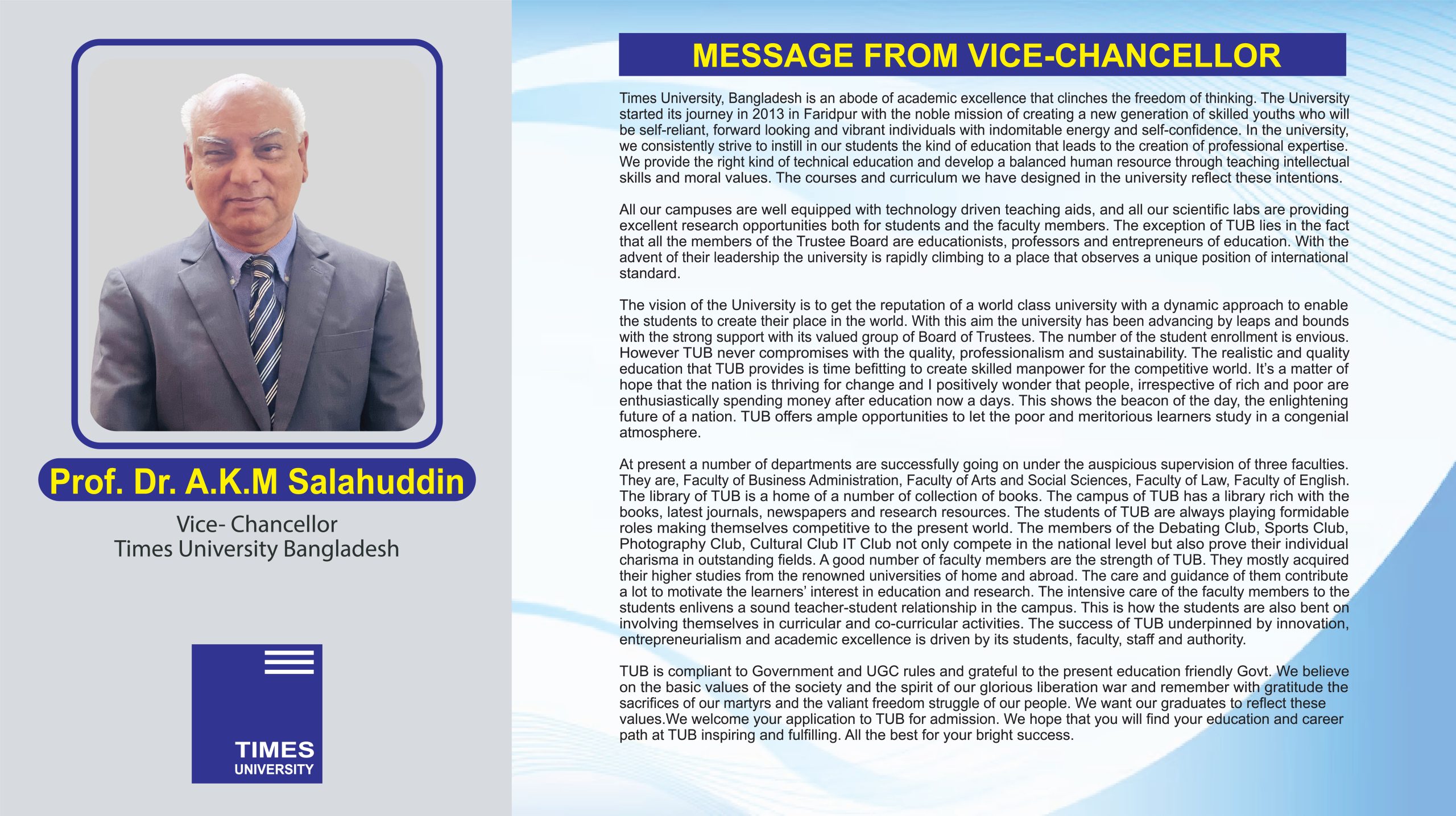 Welcome to our Times University Bangladesh- UGC & Government Approved Private University– committed to contribute in national development through producing efficient human resources. In south Bengal huge intending higher education seeking students run for Dhaka to study in the private university which makes them higher cost for acquiring higher education not even in a general quality standard. In view with a great thinking Times University has been established to provide higher education with quality by lower cost for the aspiring student of south Bengal including greater Faridpur, Barisal division and Khulna Division. We are striving to make your dream success.