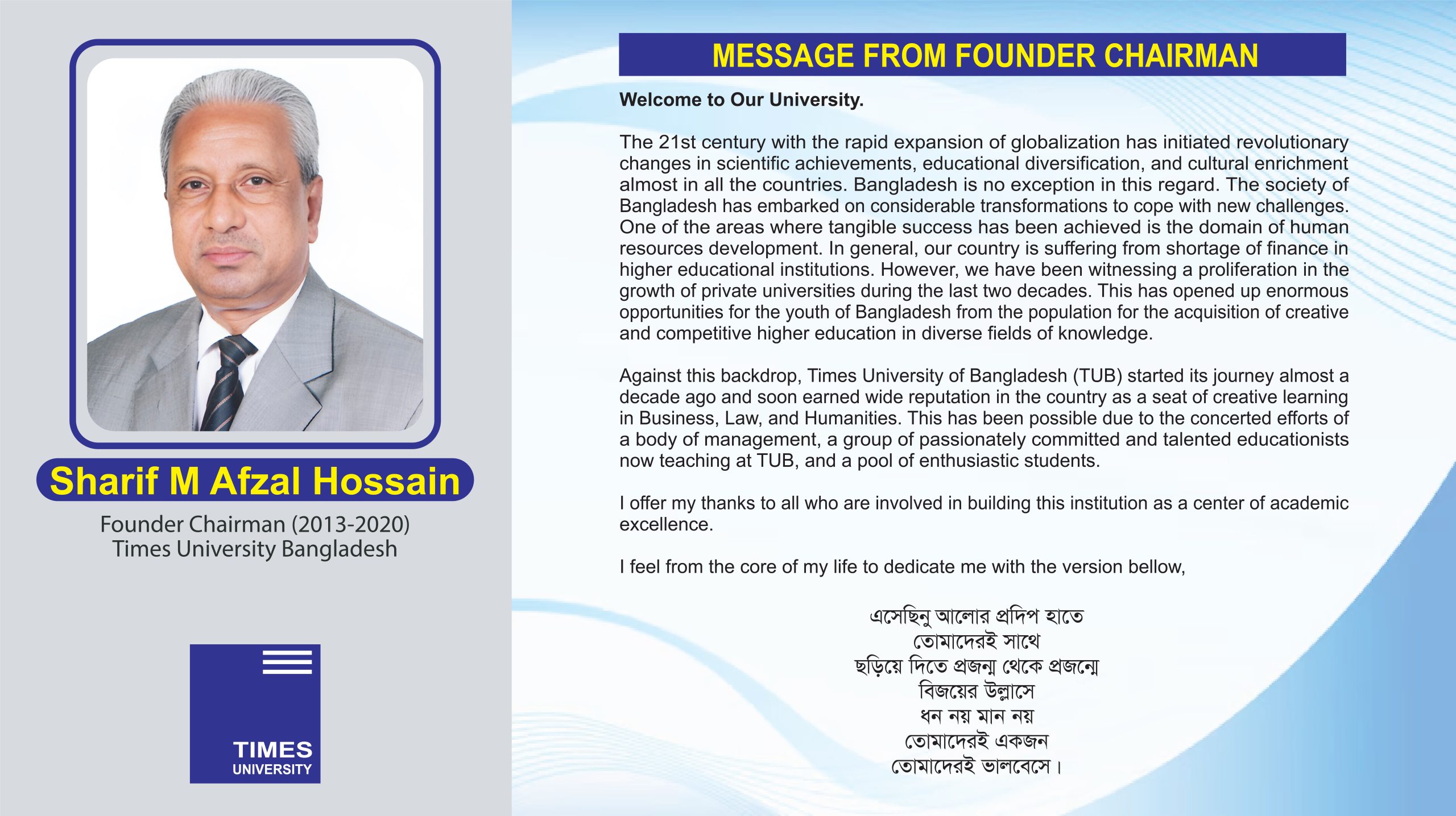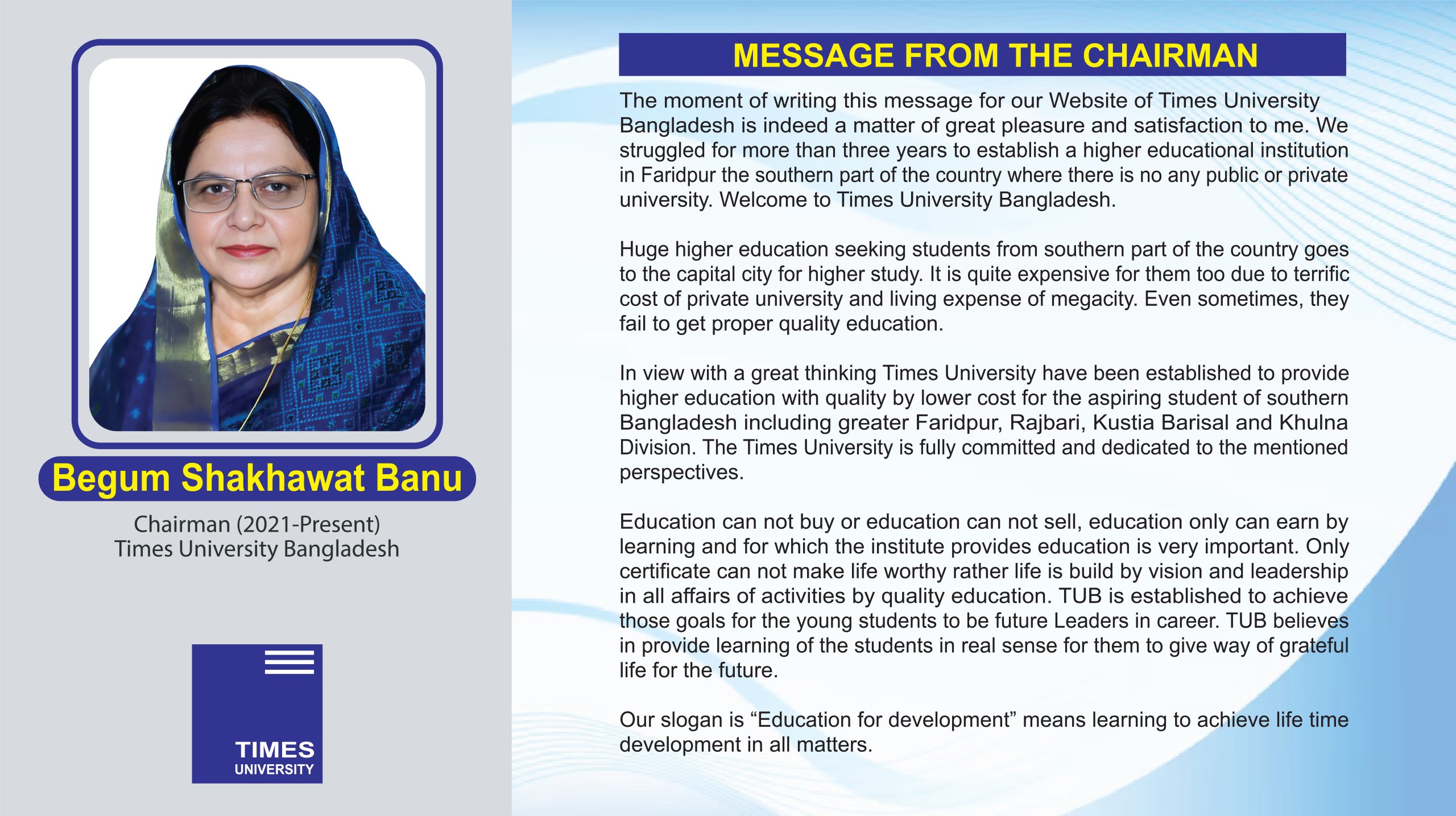 Welcome to our Times University Bangladesh- UGC & Government Approved Private University– committed to contribute in national development through producing efficient human resources. In south Bengal huge intending higher education seeking students run for Dhaka to study in the private university which makes them higher cost for acquiring higher education not even in a general quality standard. In view with a great thinking Times University has been established to provide higher education with quality by lower cost for the aspiring student of south Bengal including greater Faridpur, Barisal division and Khulna Division. We are striving to make your dream success.